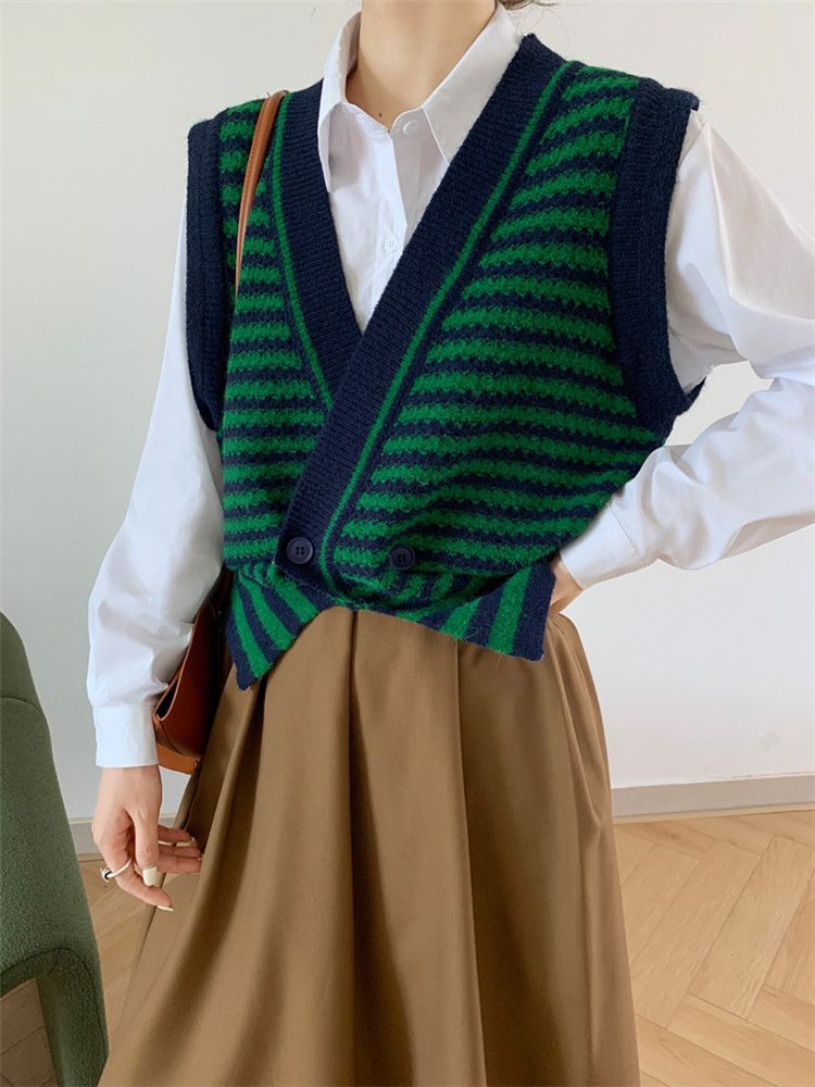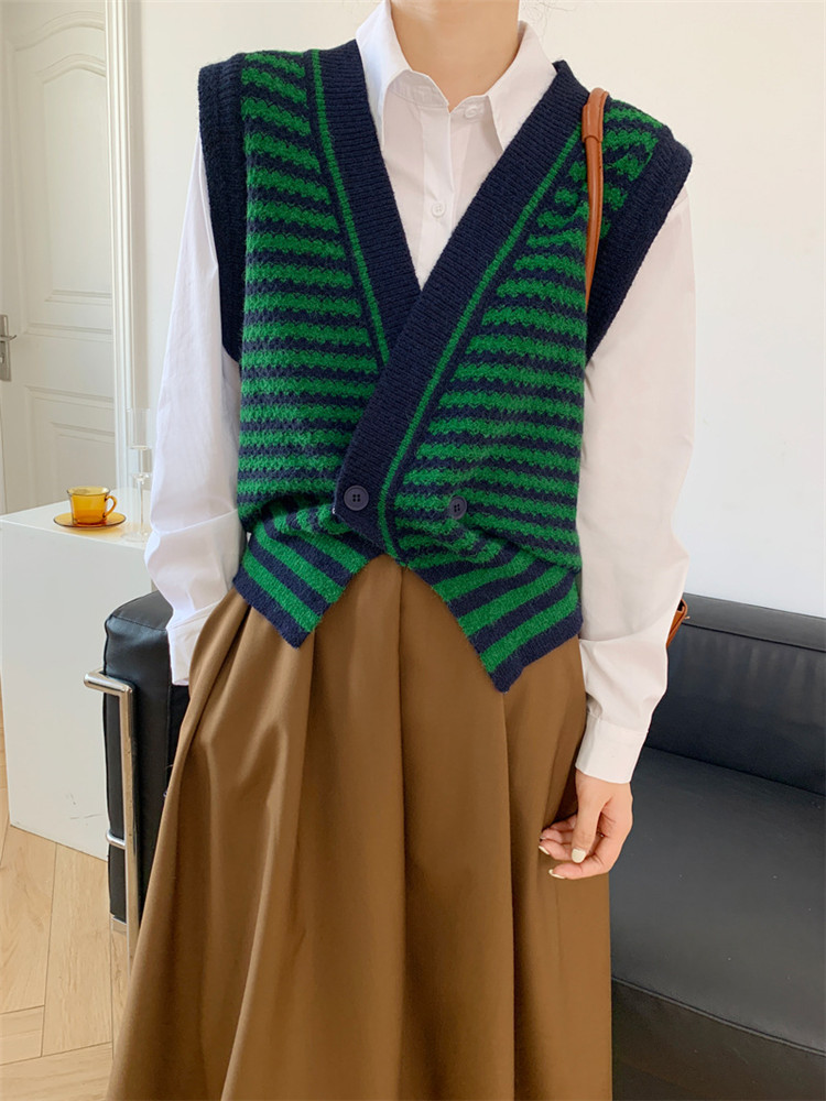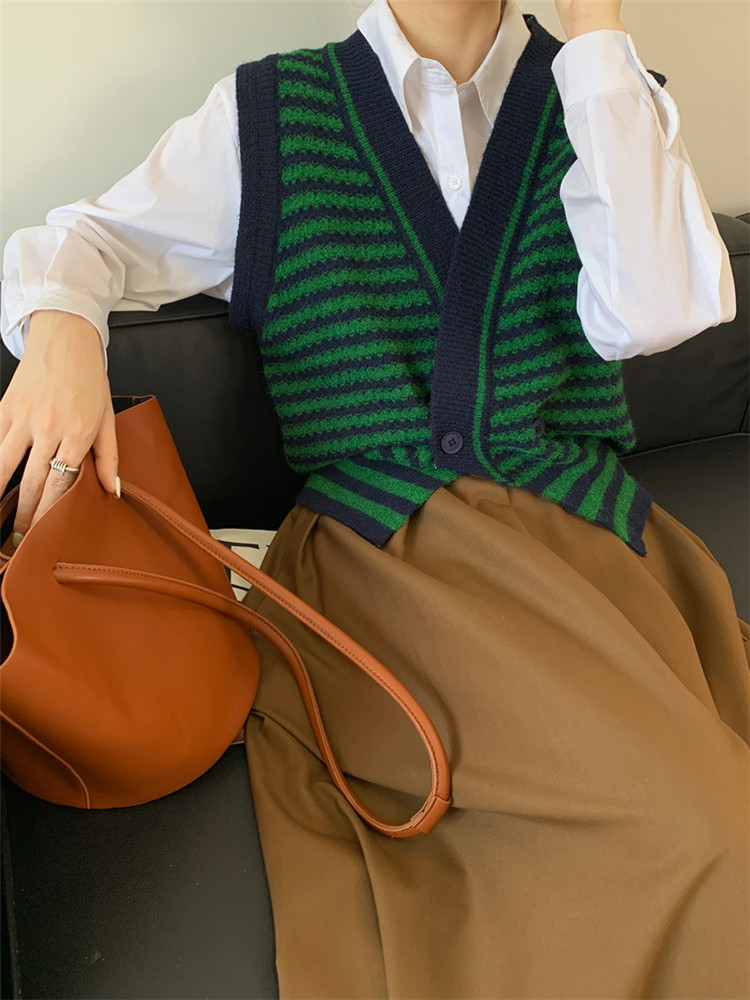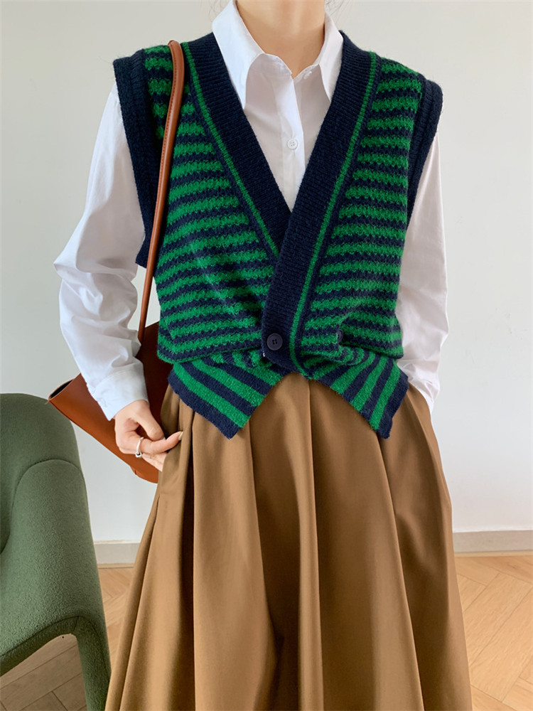 深緑とベージュのボーダー柄が上品で、袖なしデザインでレイヤードスタイルを楽しめます。