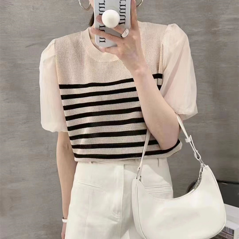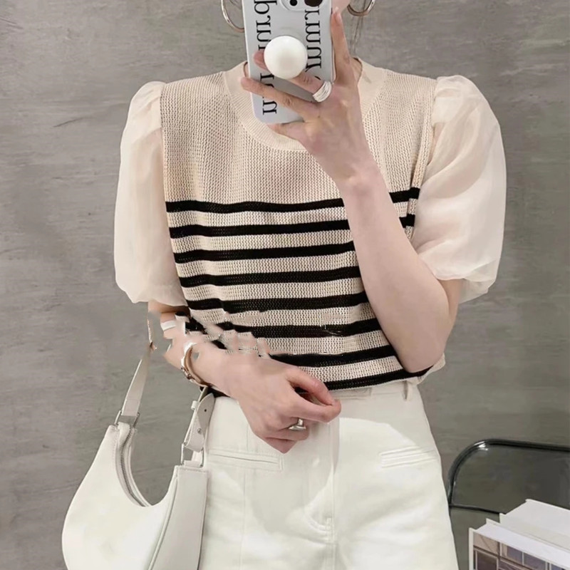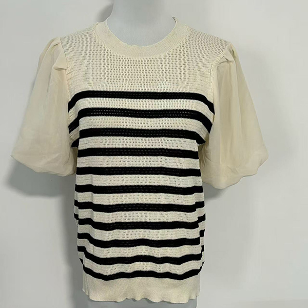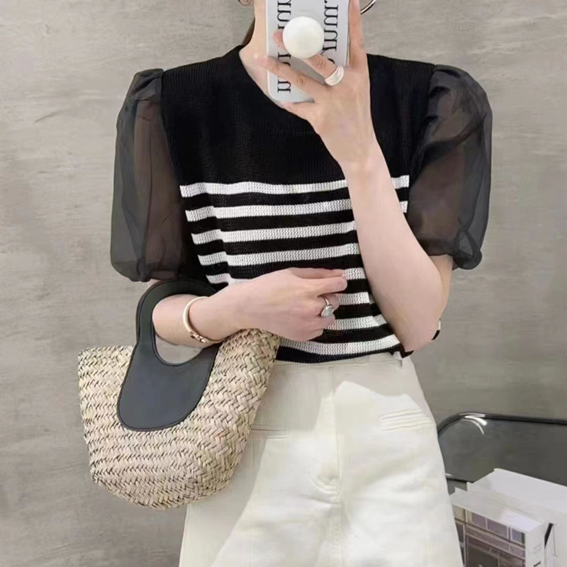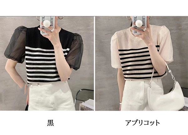 クラシックなボーダー柄と透け感のあるパフスリーブが絶妙なバランスを演出。
