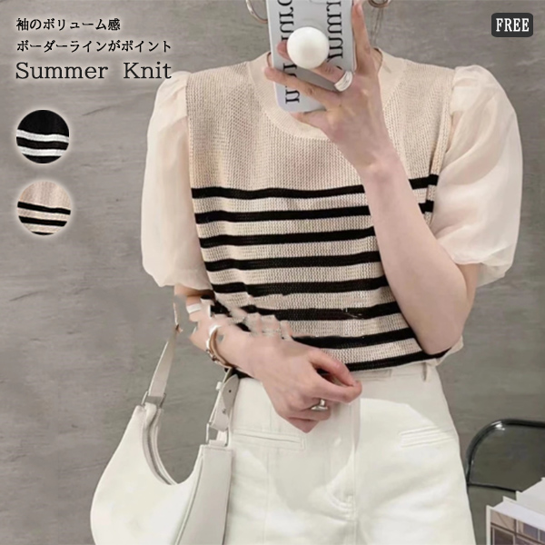 ■コメント ・袖のボリューム感とボーダーラインがポイントのサマーニット。 ・さらっと着れてお洒落にキマる春夏おすすめの一枚です◎ ・きちんと感もありながら、普段使いもできる便利アイテムです。 ・スカートやデニムなど色々なボトムスに合わせやすいです。 ■サイズ 着丈58cm 肩幅31cm バスト88cm 袖丈25cm(OK) ※平置き採寸の為、多少の誤差が生じる可能性がございますので、予めご了承ください。 ■カラー 商品画像に記載 ■伸縮性 なし ■裏地 なし ■生地の厚さ 普通 ■透け感 あり ■素材 ポリエステル100%