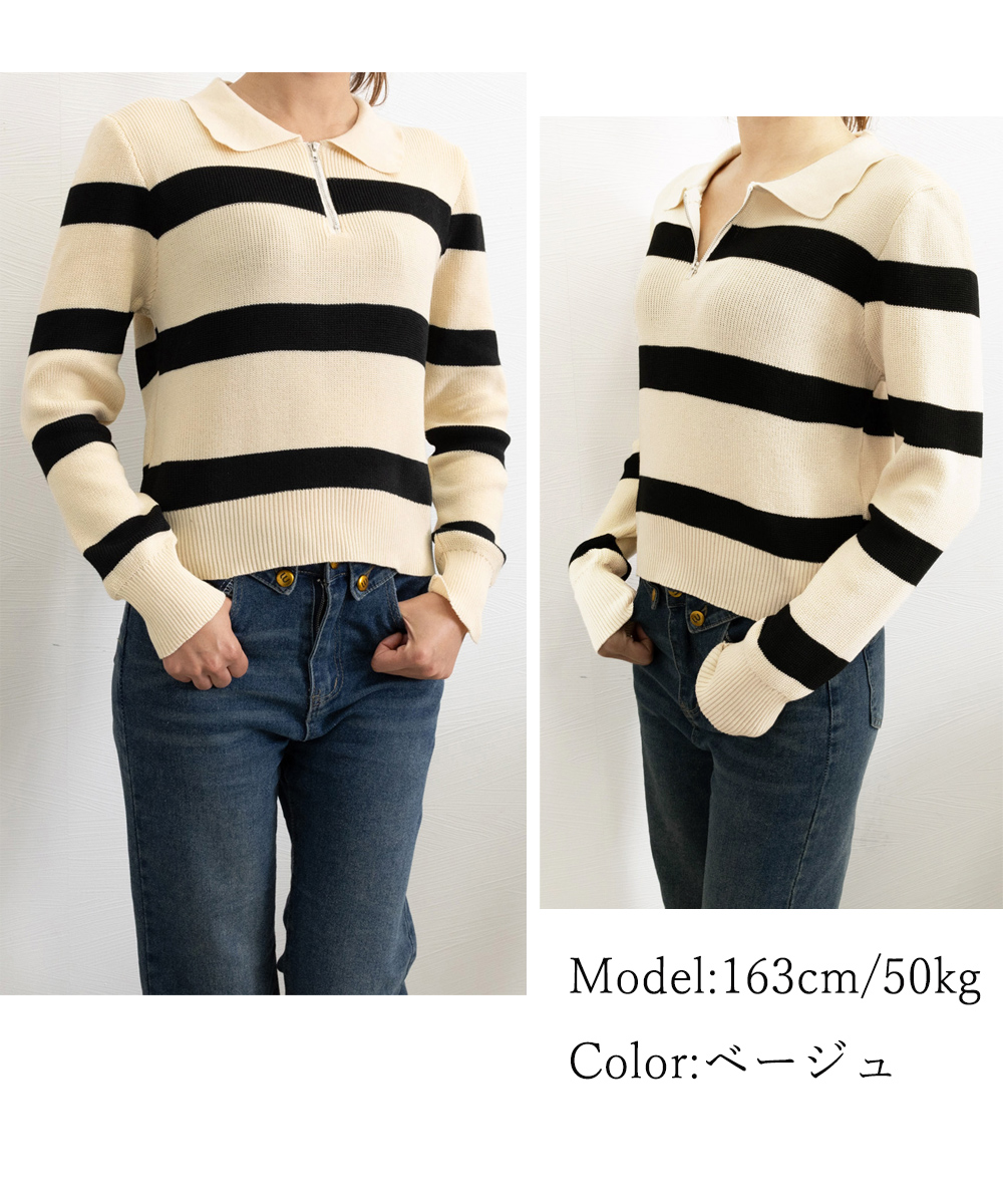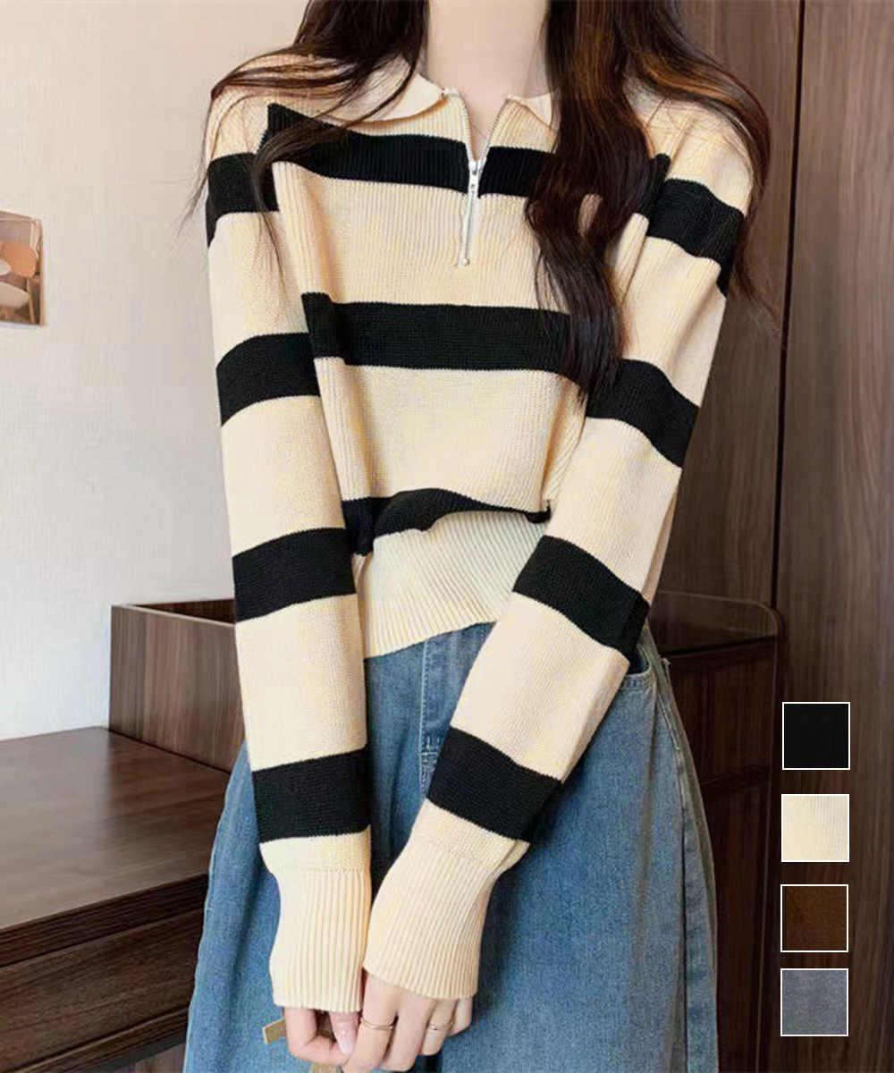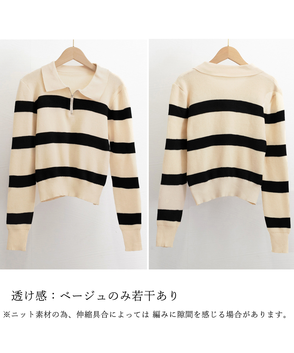 襟付きデザインがトレンド感溢れるハーフジップのボーダーニットトップスです。