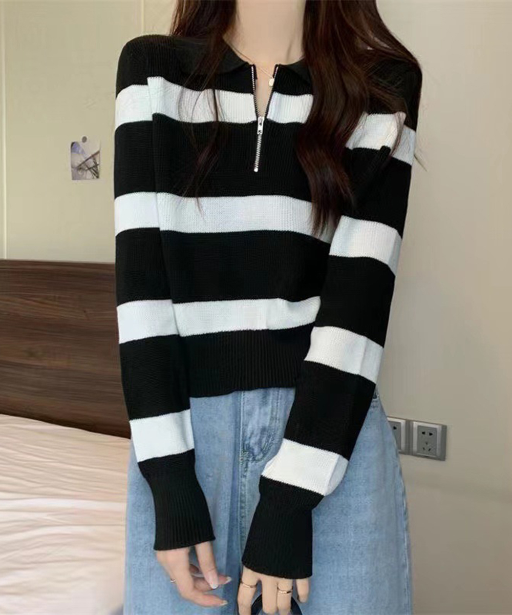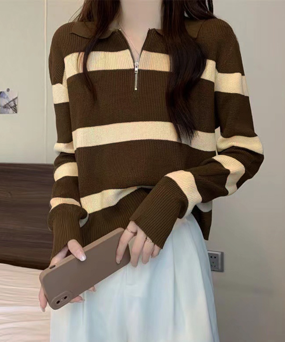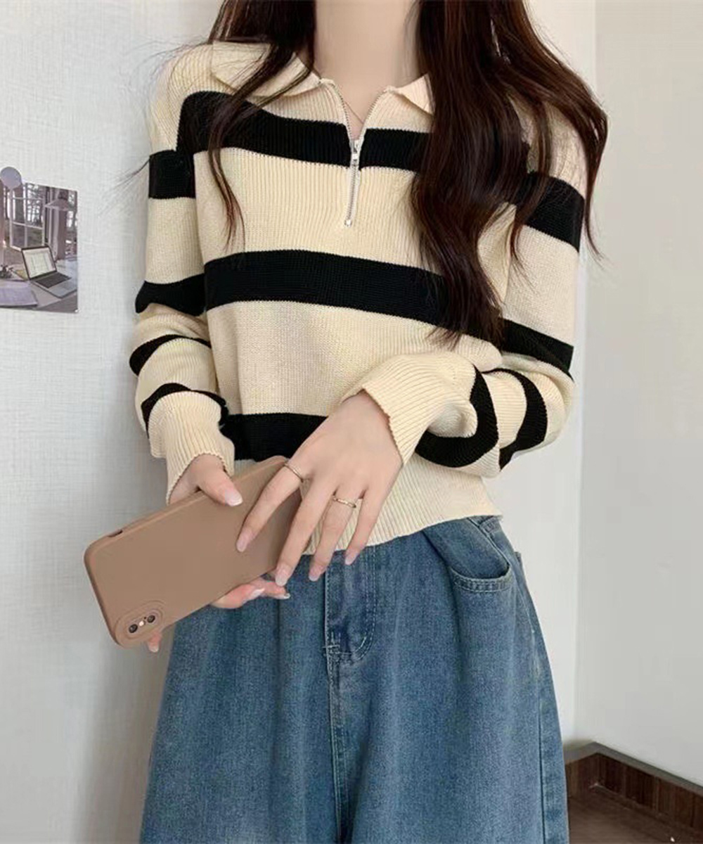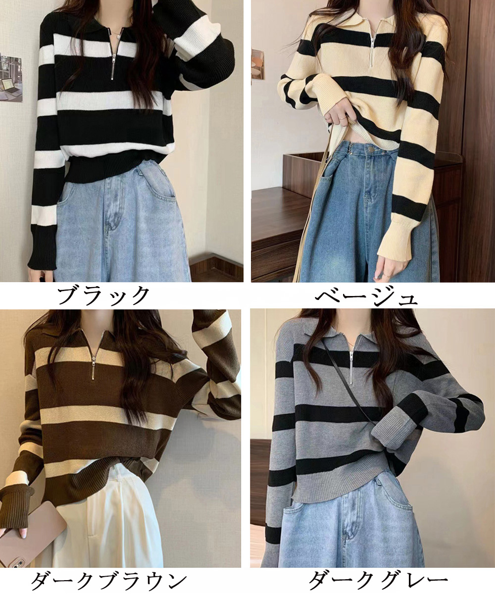 襟付きデザインがトレンド感溢れるハーフジップのボーダーニットトップスです。