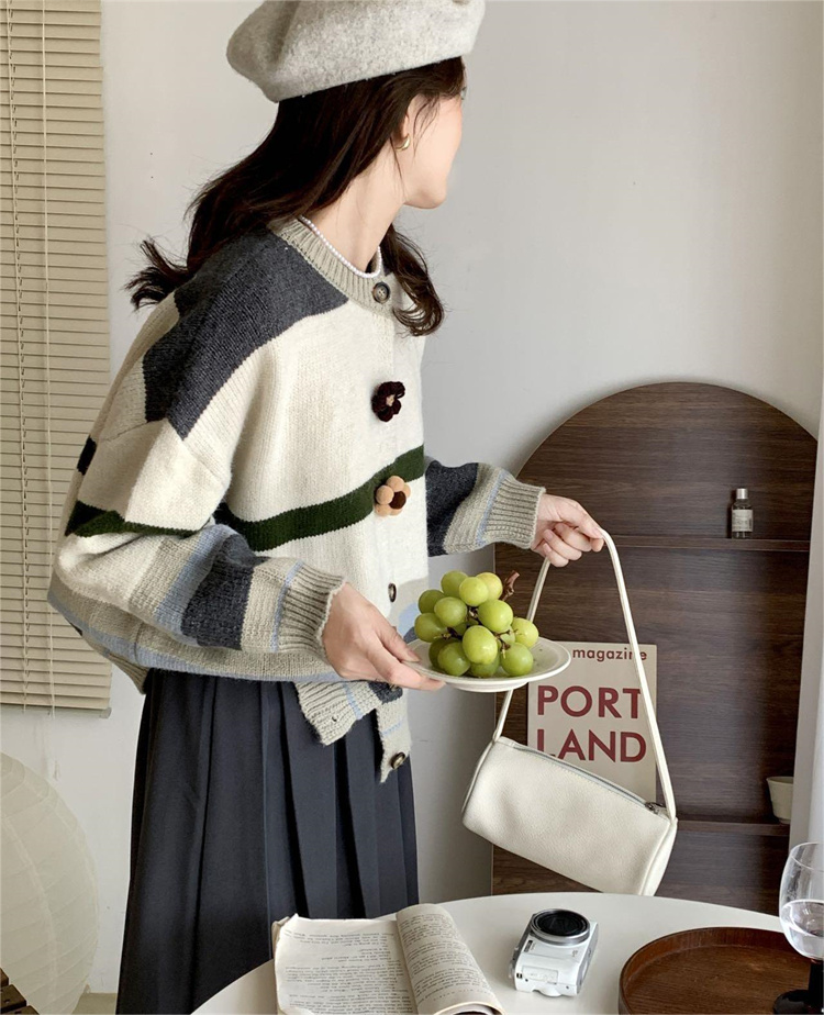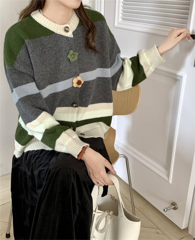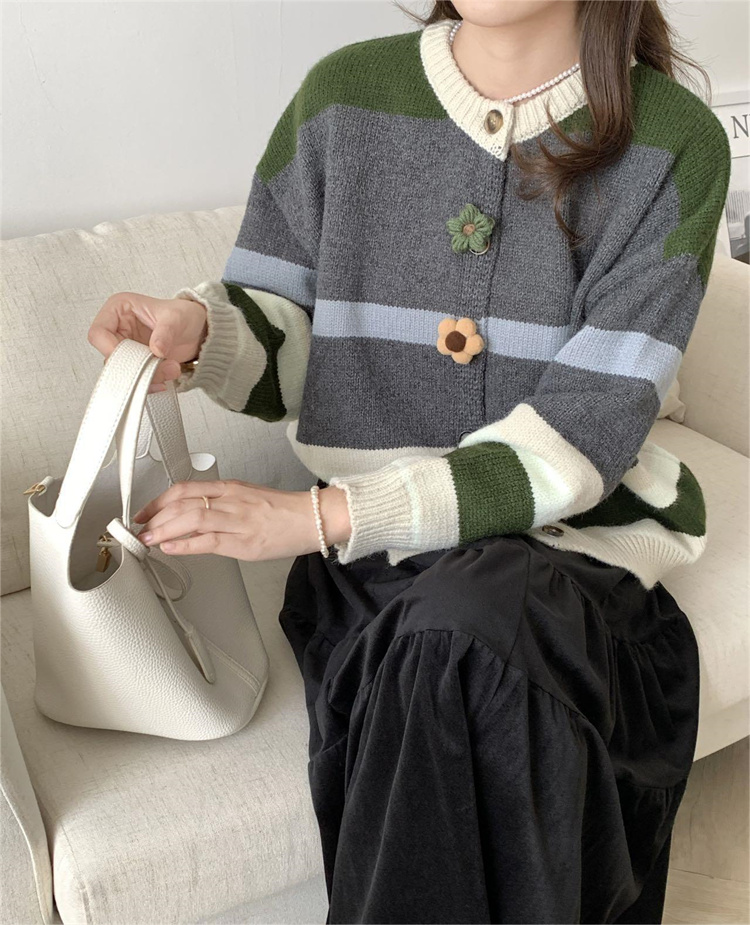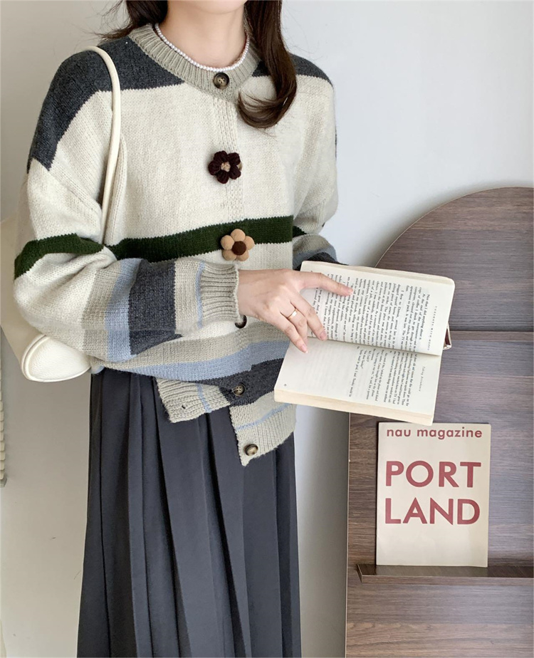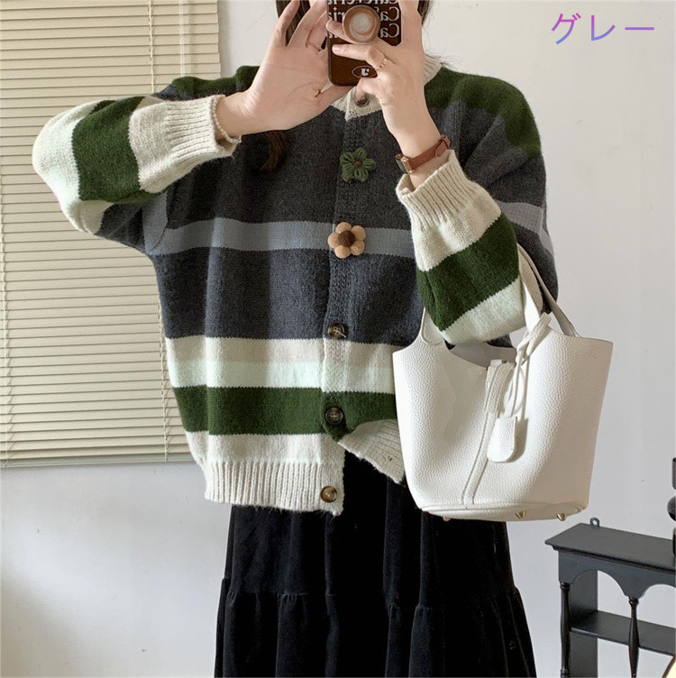 ボーダー服の定番アイテム、可愛らしい花ボタンが特徴的なニットカーディガンです。