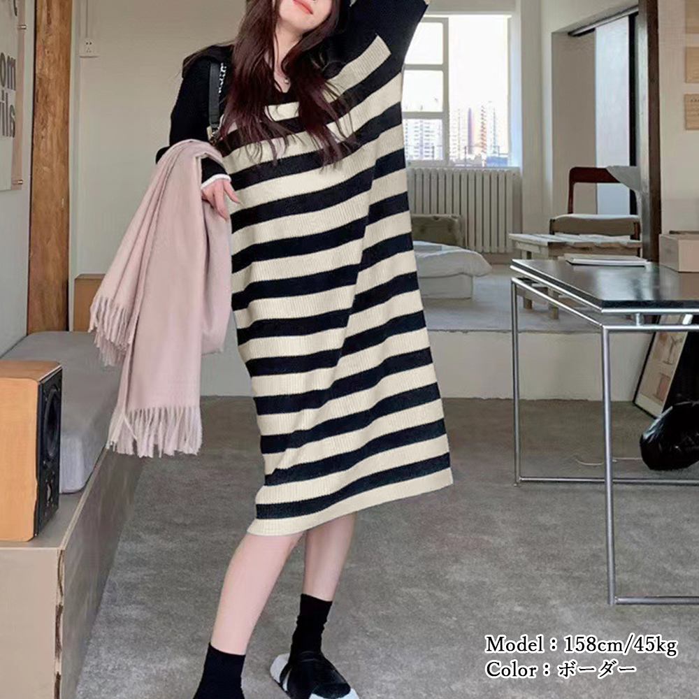 カラー:ボーダー サイズ:ワンサイズ 総丈:約95cm 肩幅:約56cm 袖丈:約45cm ゆき:約73cm 身幅:約53cm 胸囲:約106-140cm ウエスト:約104-138cm ヒップ:約104-138cm 裏地:なし 伸縮性:あり 透け感:なし ※すべて平置きサイズです(採寸方法違いより、多少の誤差がございますので、ご了承ください)。