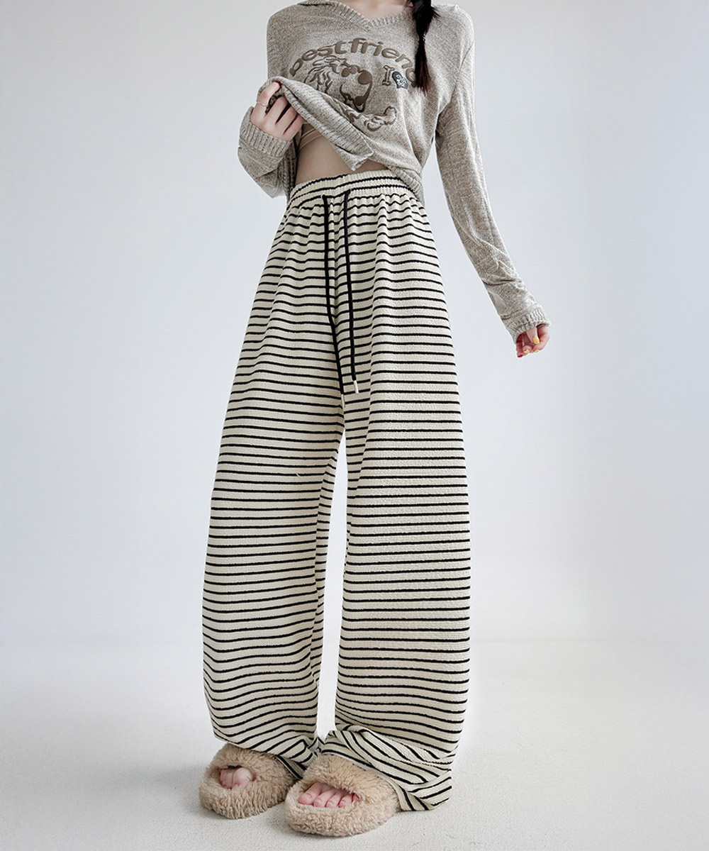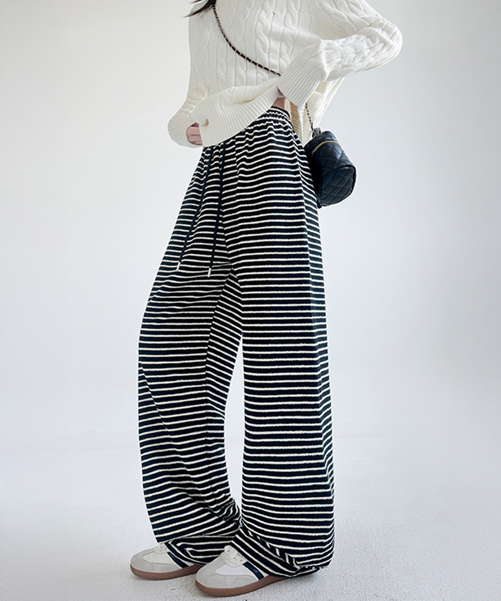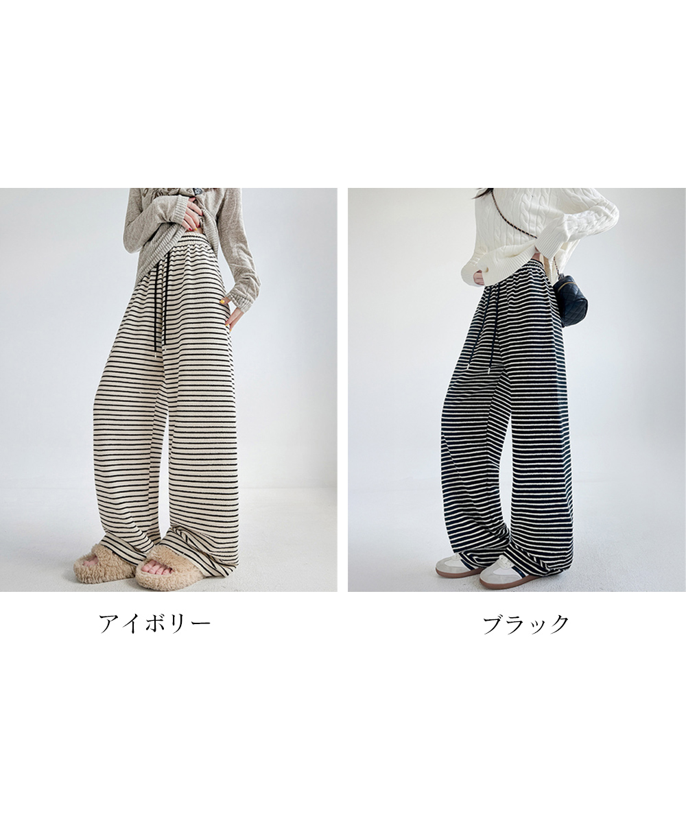 ボーダー服専門店がお届けする、落ち感のあるワイドシルエットで脚をすっきり見せるイージーパンツです。 落ち着いたボーダー配色で、ラフになりすぎず、きれいめにも着こなせる大人カジュアルなデザイン。 締め付け感のないイージー仕様で、おうち時間はもちろん、お出かけにも快適です。