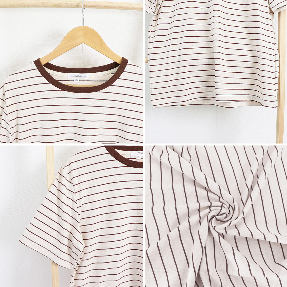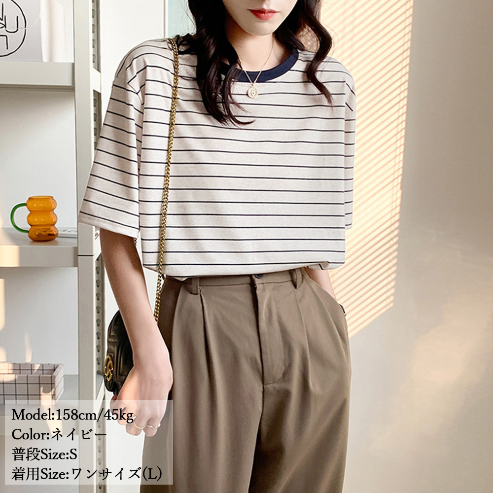 素材:ポリエステル70%+綿30% カラー:ネイビー/ブラウン サイズ:ワンサイズ(L) 着丈:約63cm 肩幅:約45cm 袖丈:約22cm ゆき:約44.5cm 身幅:約52cm 胸囲:約104-122cm 裏地:なし 伸縮性:あり 透け感:なし ※すべて平置きサイズです(採寸方法違いより、多少の誤差がございますので、ご了承ください)。